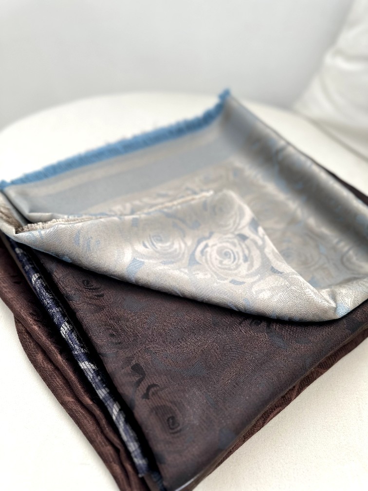 روسری ابریشم نخ ژاکارد مجلسی مدل رز آبی نسکافه ای
