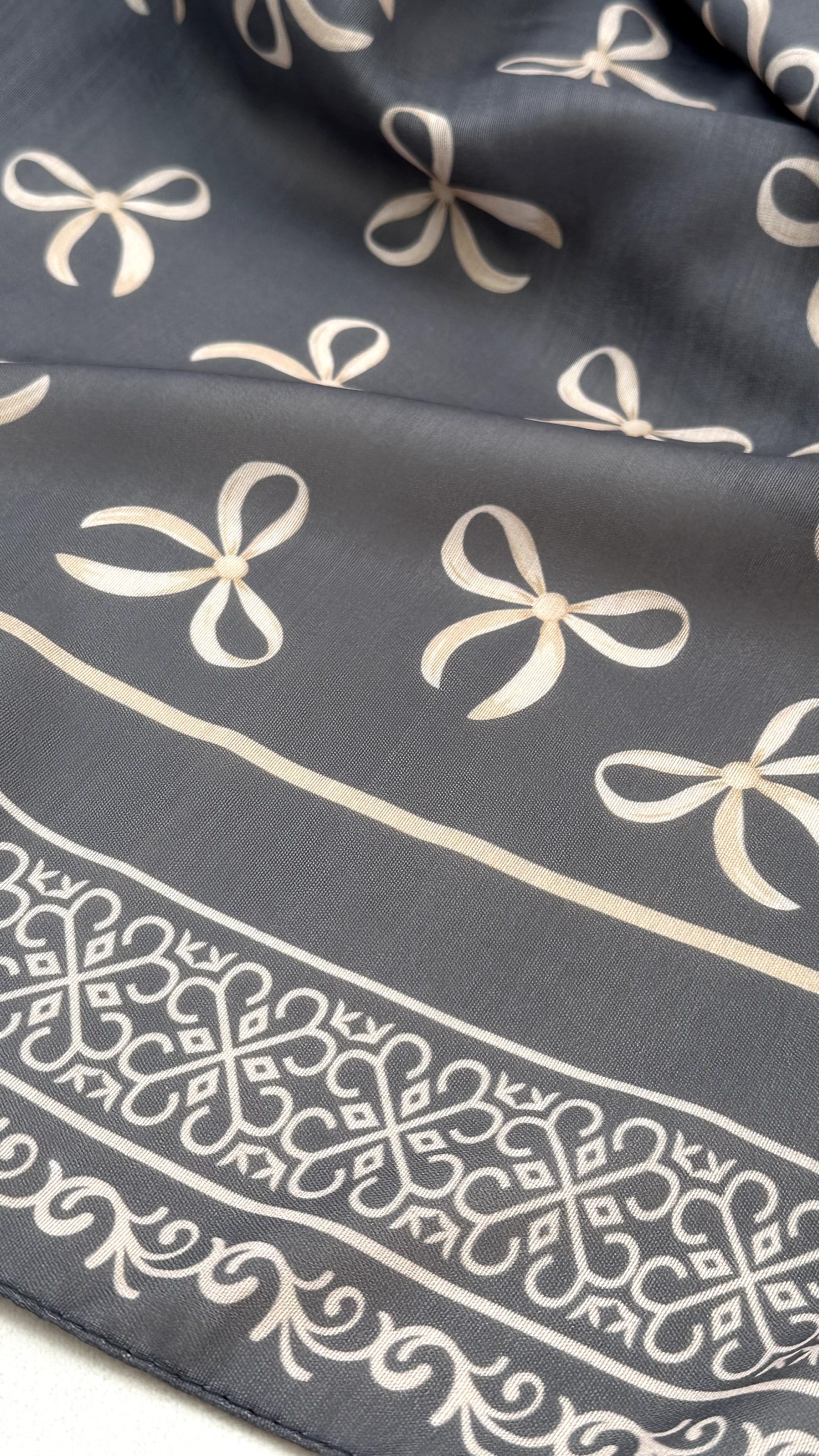روسری نخی مدل نازنین زمینه نوک مدادی پاپیون ها رنگ کرم