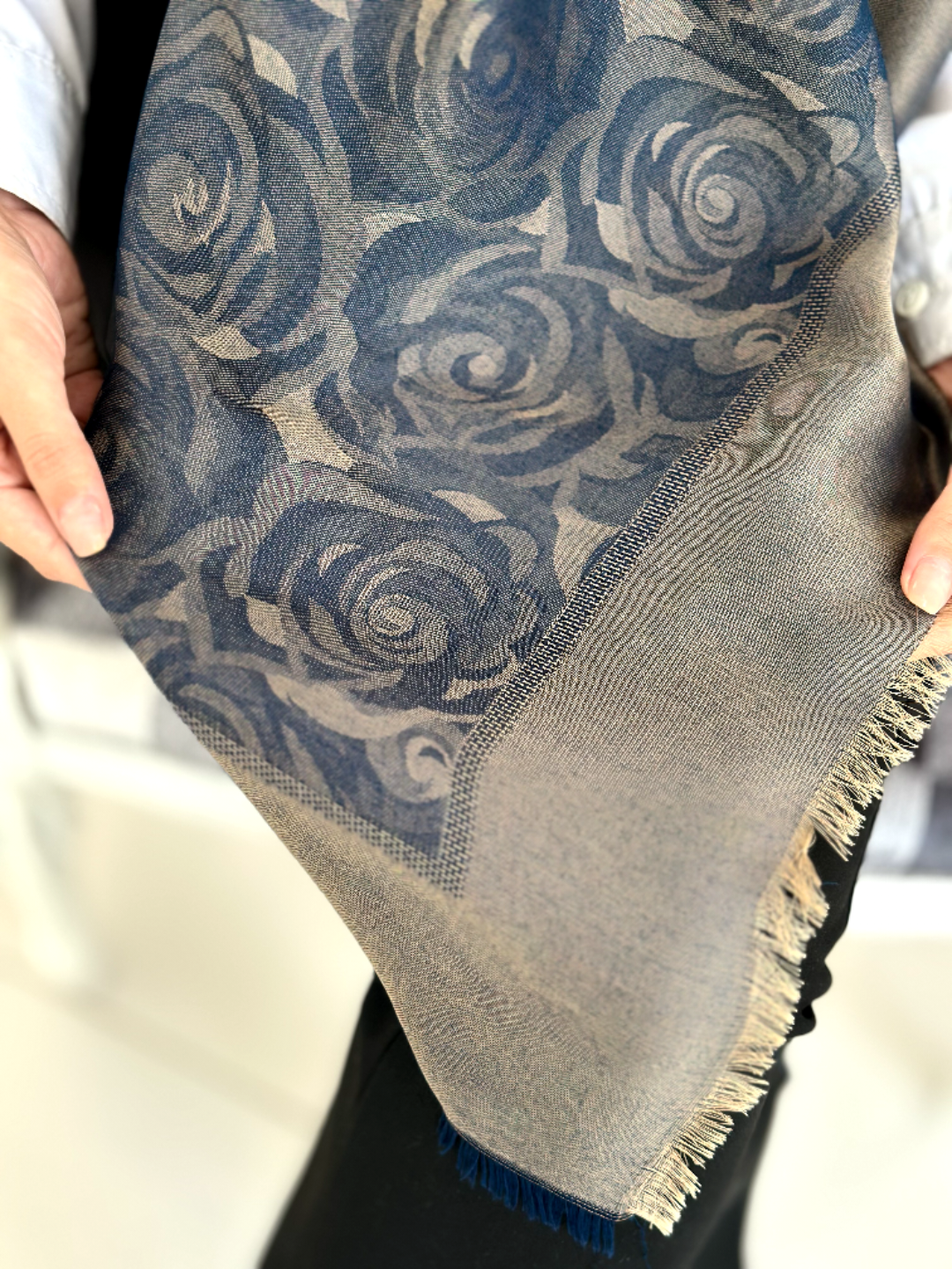 روسری نخ ژاکارد مدل رز سرمه ای مسی