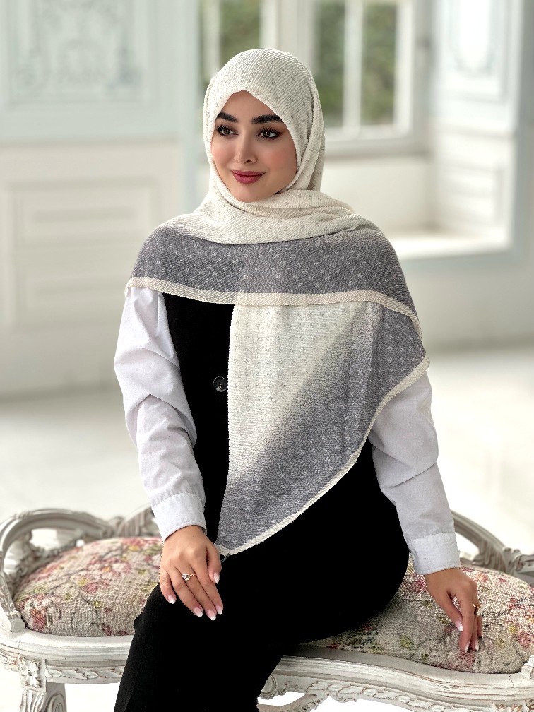 روسری پلیسه مجلسی مدل آوا تناژ کرم شیری دور تا دور طوسی ذغالی