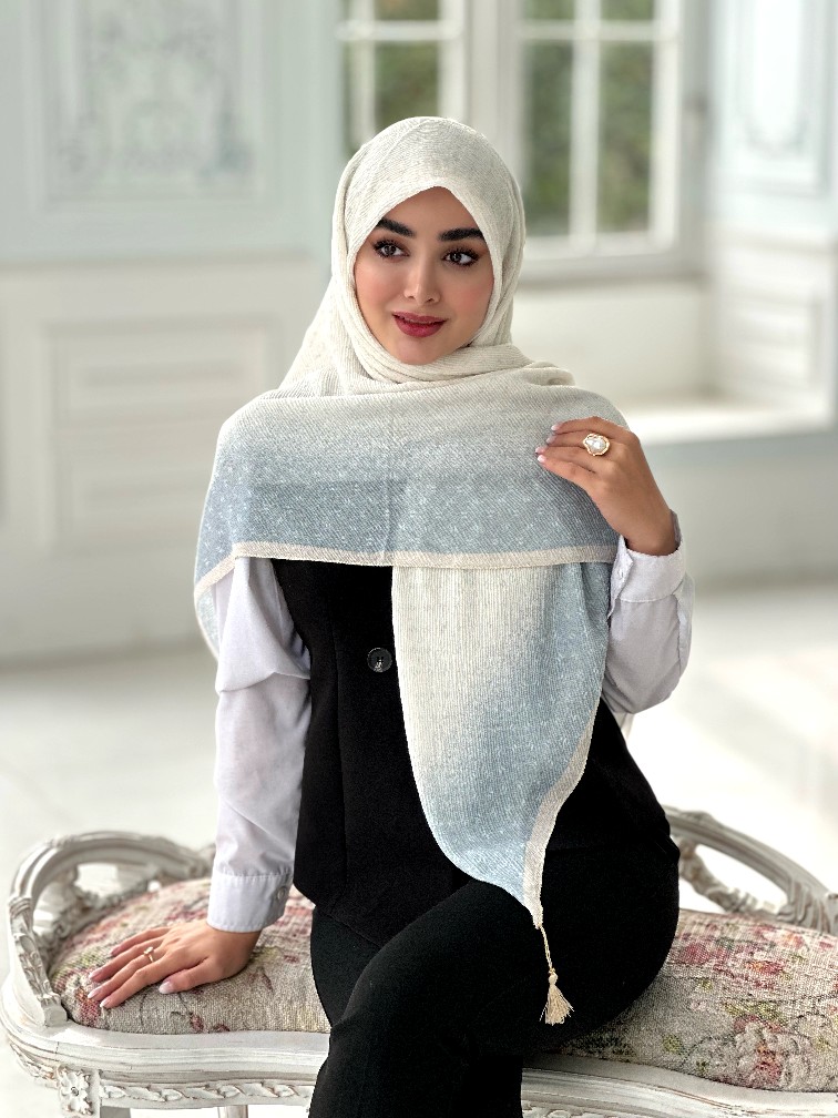 روسری پلیسه مجلسی مدل آوا تناژ کرم شیری دور تا دور آبی