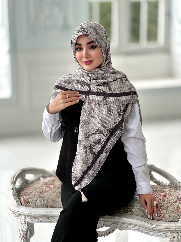 روسری پلیسه مجلسی مدل برگ تناژ طوسی مشکی