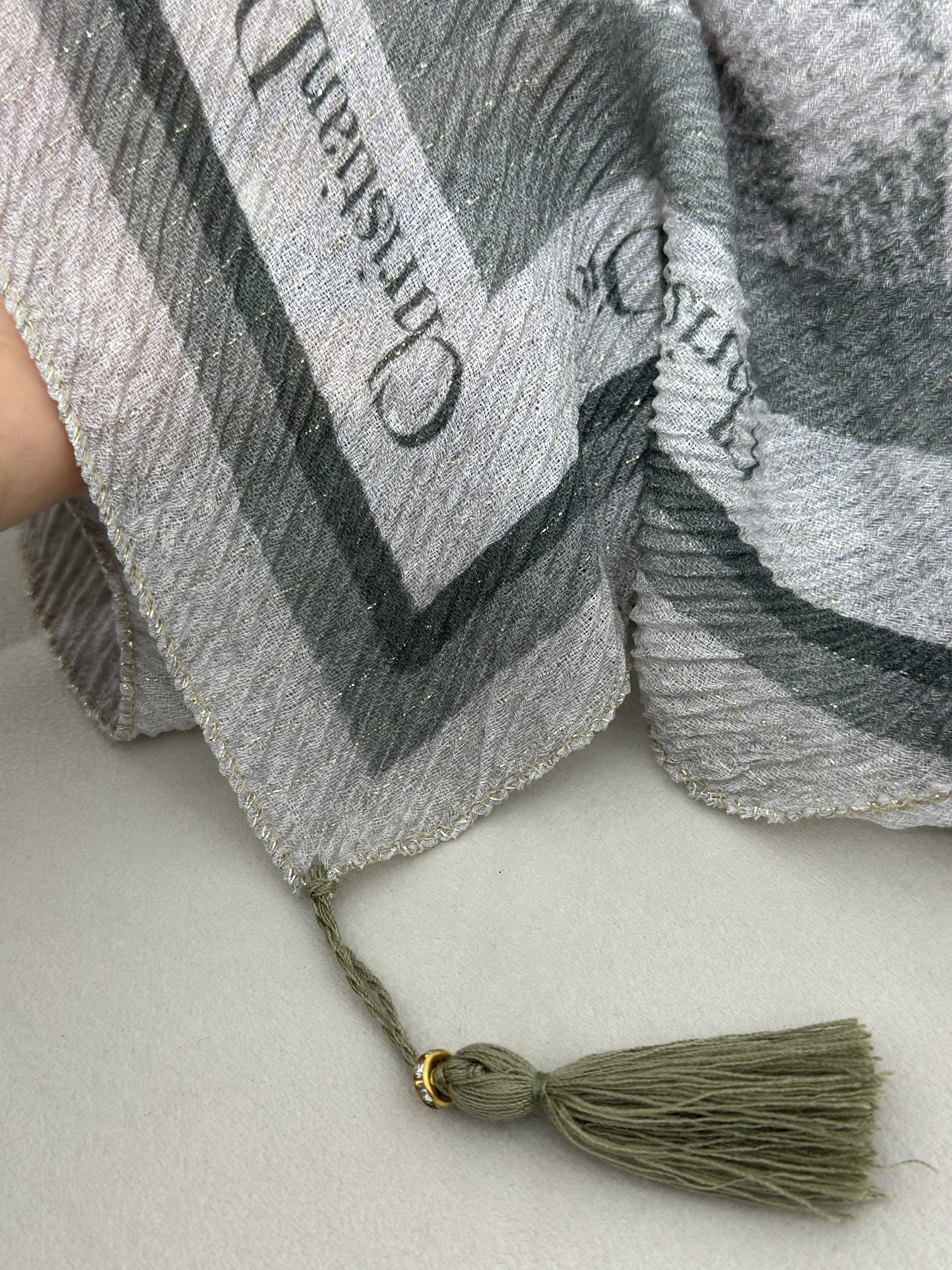 دور روسری با نخ لمه طلایی بسیار ظریف دوخت خورده شده