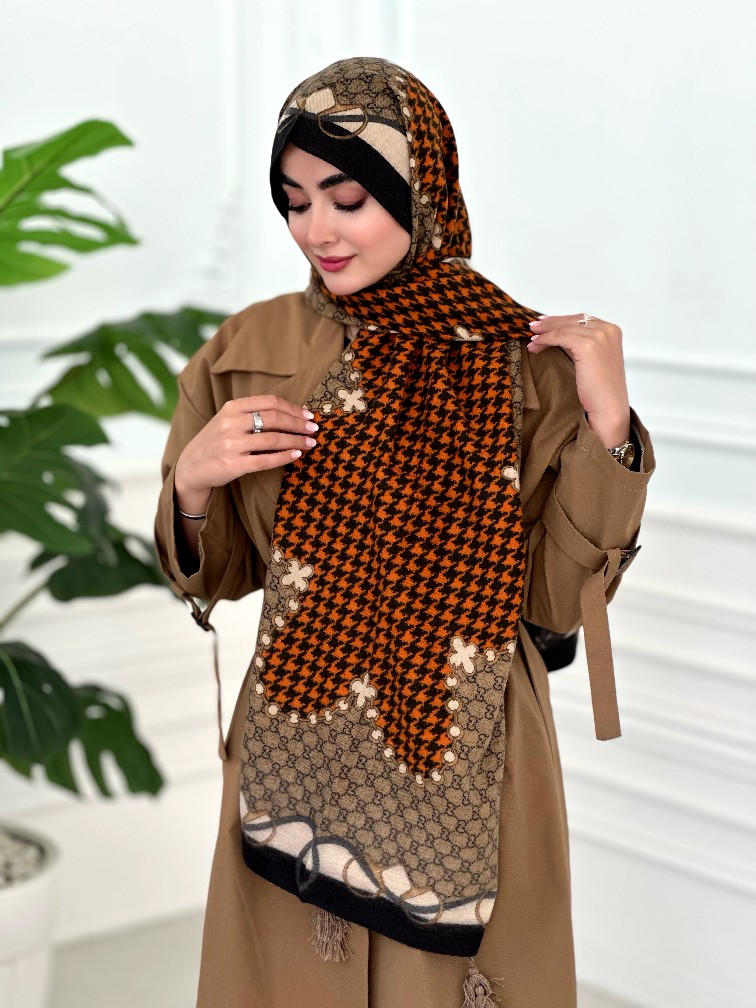 شال موهر طرح دار تناژ نارنجی نسکافه ای